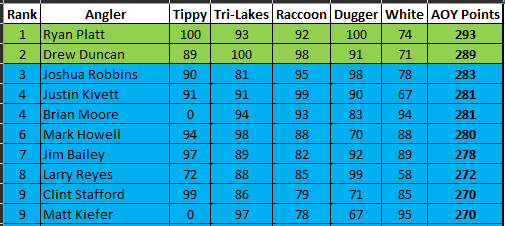 | RANK | ANGLER | MONROE | WAWASEE | SUMMIT | 5 COUNTY | WHITE RIVER | CHAMPIONSHIP | PTS |
