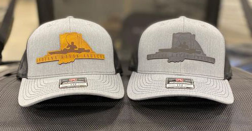 These hats are Richardson 112 adjustable hats in heather and black with dyed, hand-rubbed leather patches. There are two options available: Brown dye and black dye.